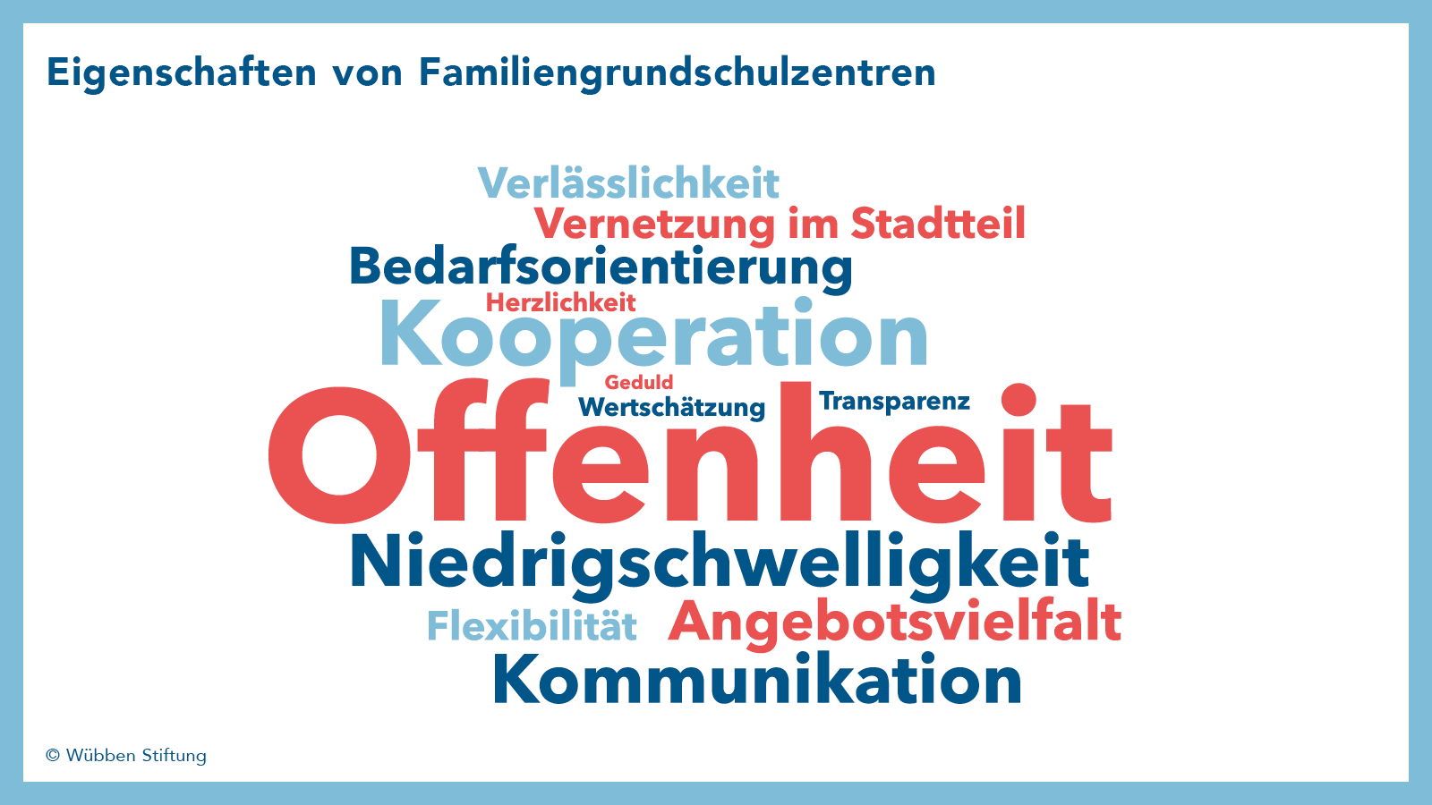 In Nordrhein-Westfalen entwickeln sich inzwischen mehr als 130 Grundschulen zu Familiengrundschulzentren (FGZ). Die Wübben Stiftung hat im Februar 2022 eine Umfrage unter allen FGZ durchgeführt. Bei der heutigen Entwicklungskonferenz „Familiengrundschulzentren in NRW” in Düsseldorf wurde die Umfrage vorgestellt und diskutiert. Die Umfrage zeigt, dass sich die Schulen zu 91% eine langfristige Finanzierung wünschen und Verlässlichkeit und Planungssicherheit brauchen, damit die vielen neuen Angebote wie Alphabetisierungskurse und Gesundheitsangebote, die für Familien entstanden sind, fortgesetzt werden können.